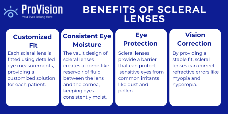 Scleral lenses offer several advantages, including sharp vision correction, consistent eye moisture, protection for sensitive eyes, and comfort for people with irregular corneas. Scleral contacts offer a solution for conditions that make regular contact lenses uncomfortable, including keratoconus, severe dry eye, and other eye diseases and refractive errors.