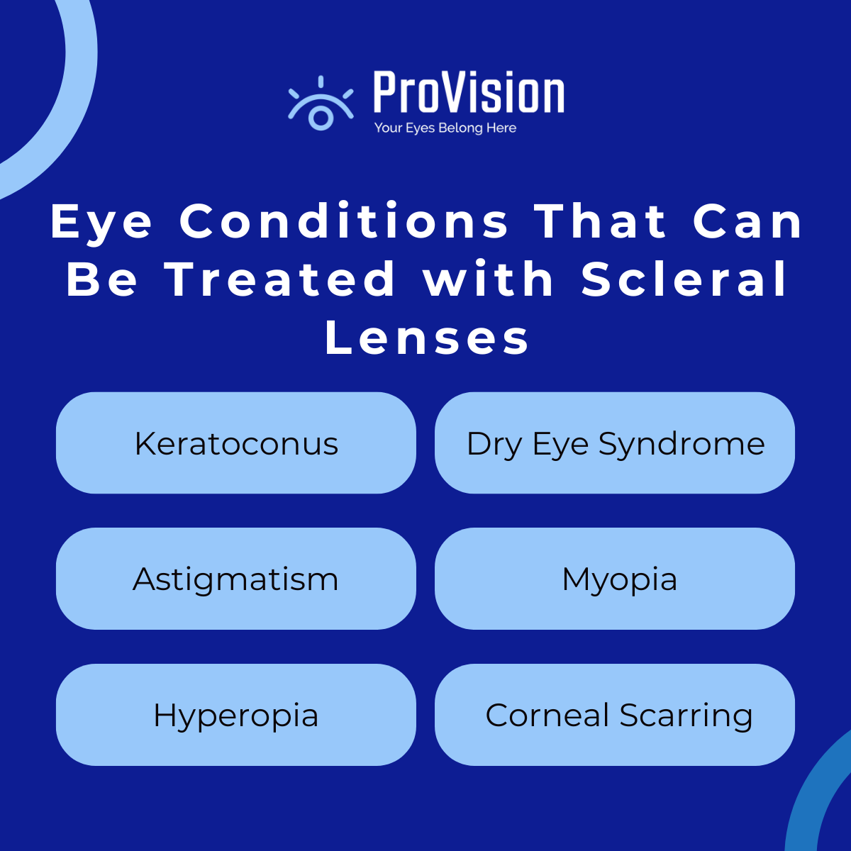 Scleral lenses offer a stable fit that can consistently and effectively correct various vision problems. They can provide relief for people with several eye conditions and refractive errors, including: